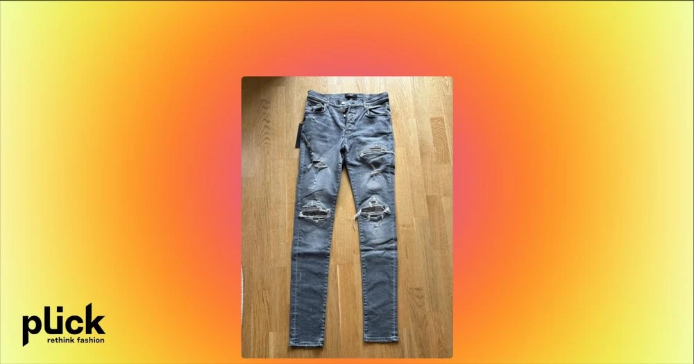 Grå slitna skinny jeans från Amiri - Snygga grå jeans från Amiri med tydliga slitningar och hål över knäna och låren. Modellen är skinny fit med klassisk femficksdesign och silverfärgade knappar. Jeansen har en cool, tvättad look och är gjorda i stretchig denim för skön passform. Bra kvalitet och har knappt använts.