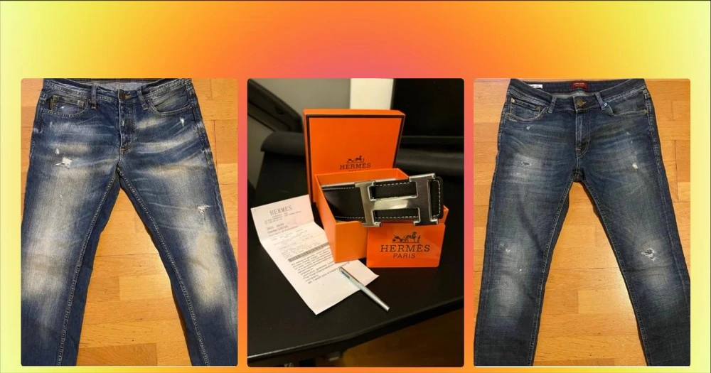 H svart läderbälte med H-spänne - Säljer ett exklusivt svart läderbälte från H med det ikoniska H-spännet i metall. Bältet kommer i original orange H-box och har vita kontrastsömmar längs kanterna. Perfekt accessoar för dig som gillar lyxiga detaljer och klassisk design.