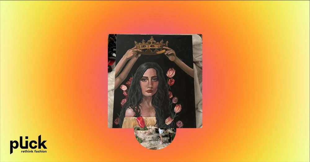 Okänd titel (målning av kvinna med krona och blommor) - Canvastavla målad med akrylfärg 46x37,5cm