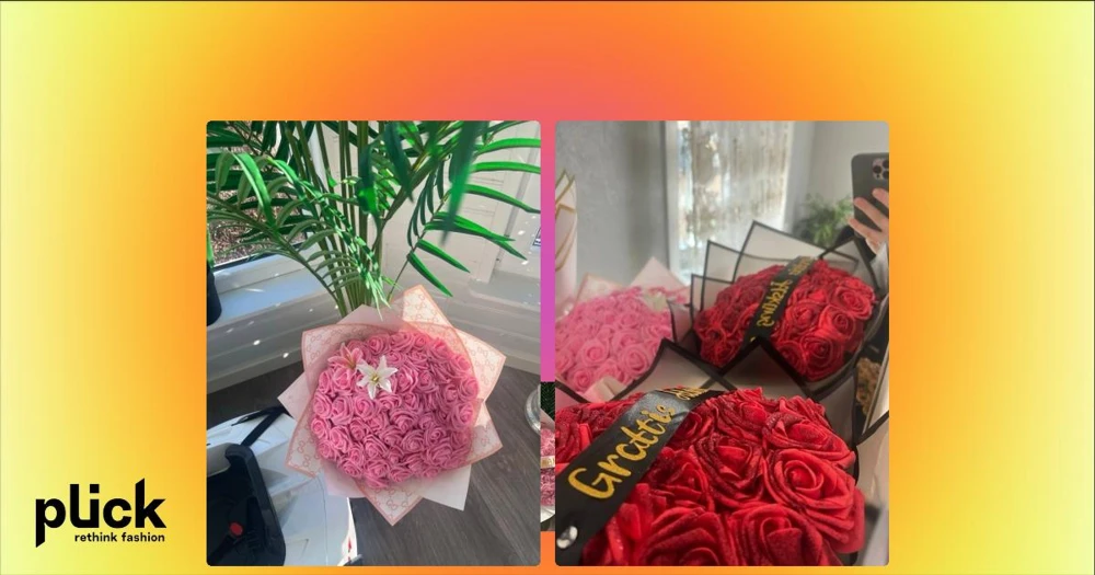 Bukett med konstgjorda rosor - Säljer en bukett med röda konstgjorda rosor, dekorerad med ett svart band där det står 'Grattis' i guldtext. Rosorna är tätt packade och ger ett lyxigt intryck, perfekt som present eller dekoration.