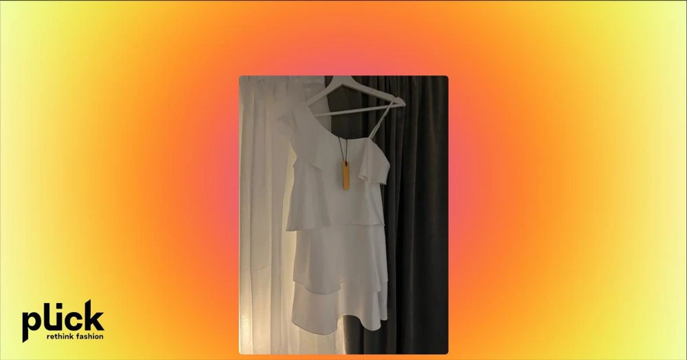 Vit omlottklänning med volanger - Supersöt vit kortklänning med lager på lager-volanger och oneshoulder-design. Klänningen har en tunn axelrem på ena sidan och bred volangkant över axeln. Perfekt för sommarens alla tillfällen!