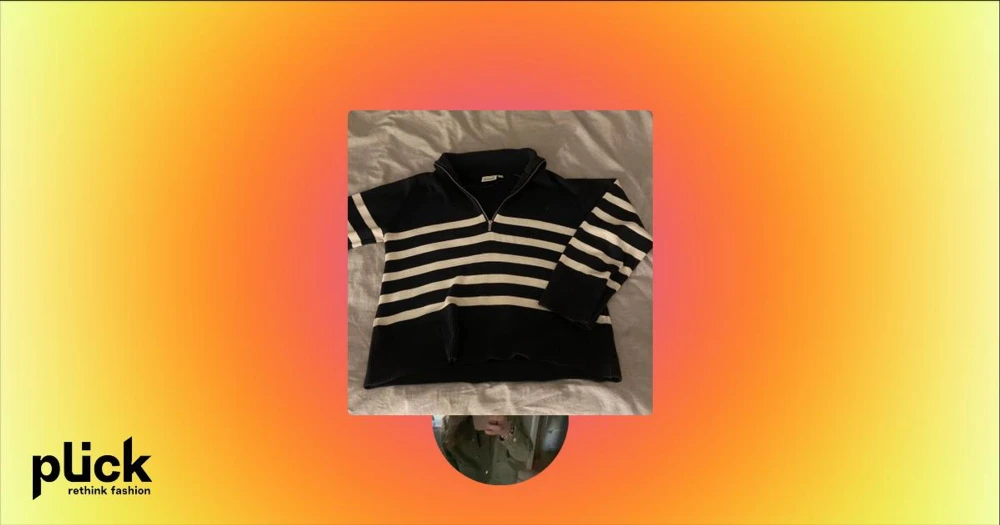 Randig stickad tröja Kappahl - Snygg stickad tröja från Kappahl i mörkblått och vitt med breda horisontella ränder. Tröjan har en hög krage och en half zip-dragkedja framtill. Långärmad med breda muddar och skön passform. Perfekt för dig som gillar klassisk stil med en twist.