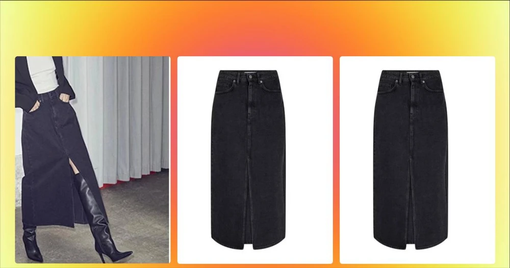 Svart lång jeanskjol med slits - Stilren svart långkjol i denim med hög midja, klassisk femficksdesign och en snygg slits framtill. Kjolen har knapp- och dragkedjestängning och passar perfekt till boots eller sneakers för en trendig look.