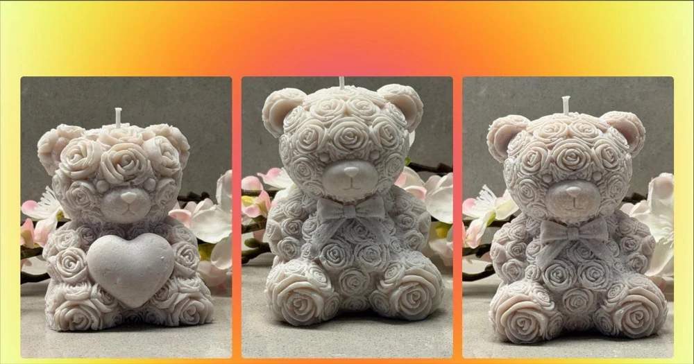 Nalleljus i sojavax  - .Exklusiv rosnalle i ekologiskt sojavax 🧸🌸 En handgjuten nalle med vackra rosendetaljer – skapad för att vara både en fin inredningsdetalj och en uppskattad gåva.  Tillverkad av svenskt ekologiskt sojavax med en brinntid på cirka 2 timmar.  • Höjd: ca 8 cm • Handgjord med omsorg – varje exemplar är unikt  Perfekt till babyshower, dop eller som en kärleksfull present ✨