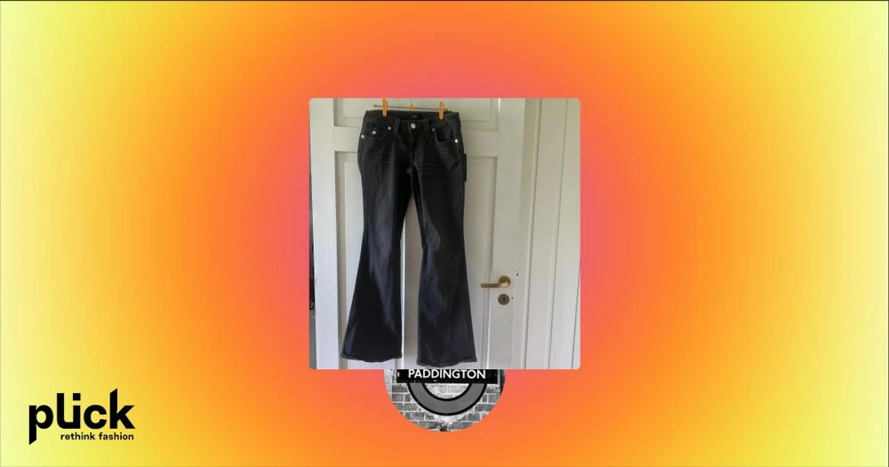 True Religion Joey Low Rise Flare Jeans - Oanvända Snygga gråa jeans från True Religion, modell Joey Low Rise Flare. De har låg midja, utsvängda ben och coola detaljerade bakfickor med silverknappar. Jeansen är i stretchig denim och har en mörk tvätt.