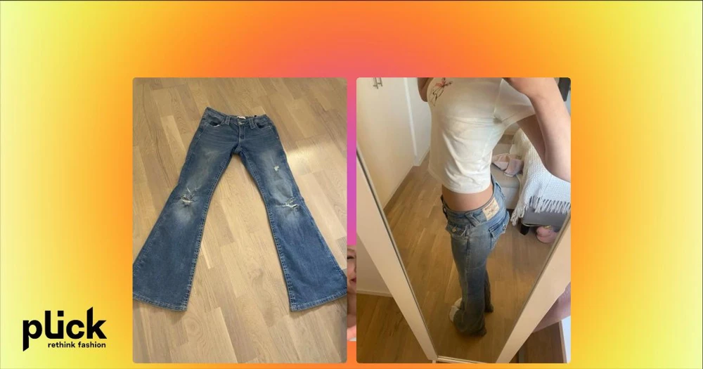 Blå utsvängda jeans med slitningar från Gina - Säljer ett par lågmidjade, blå, utsvängda jeans med slitningar på knäna och snygga glittriga broderade detaljer på bakfickorna. Jeansen är i storlek 164 och knappt använda.