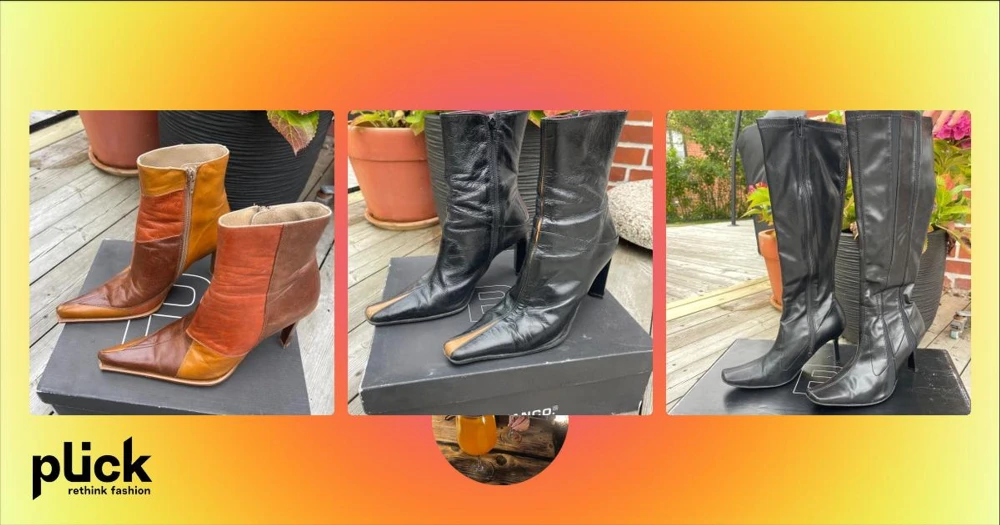 Patchwork stövletter från Bianco - Unika stövletter i patchwork-stil från Bianco med höga klackar och spetsig tå. Skorna är i skinn och har paneler i brunt, orange och senapsgult. Dragkedja på insidan för enkel påtagning. Perfekta för dig som vill sticka ut med retrovibbar. Köpta på 90-talet.