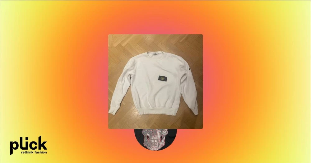 Vit Stone Island sweatshirt med patch - Vit sweatshirt från Stone Island med klassisk rund hals och långärmad passform. Tröjan har den ikoniska Stone Island-patchen på vänster ärm, fästad med svarta knappar. Använd men utan större defekter.