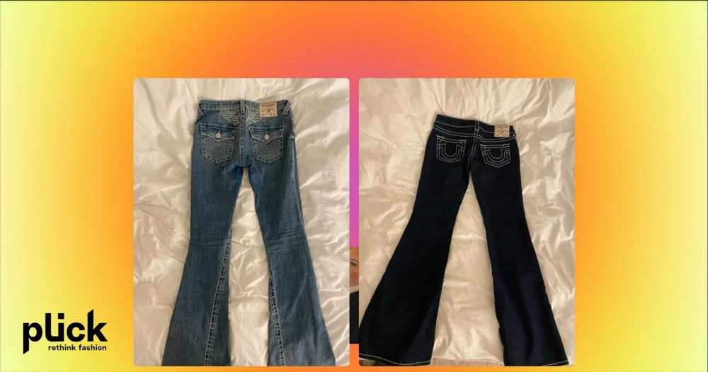 Blå bootcut jeans från True Religion - Säljer ett par blå bootcut jeans från True Religion med vita kontrastsömmar och broderade detaljer på bakfickorna. Jeansen har låg midja och klassisk femficksdesign. Materialet är denim i bomull med lätt slitning för en cool look.