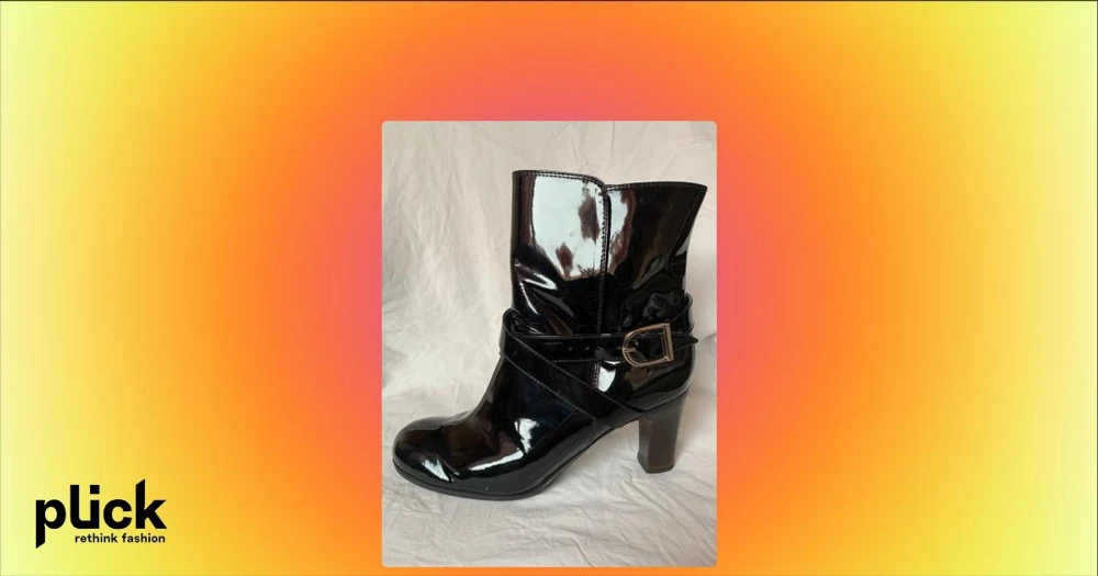 Svarta lackstövletter med klack - Säljer ett par svarta stövletter i glansigt lackmaterial (tror allt är läder) med rund tå och hög klack. Skorna har snygga remmar med metallspänne runt ankeln som ger en cool detalj. Perfekta för dig som gillar statement boots med lite edge. Klackhöjd som högst 7,5 cm. Sparsamt använda men har lite skav på sulans kant samt klack, och lite veck i lacken som det ju blir. Helhetsintrycket är dock väldigt gott och mycket fräscht inuti. Lite små i storleken kanske.