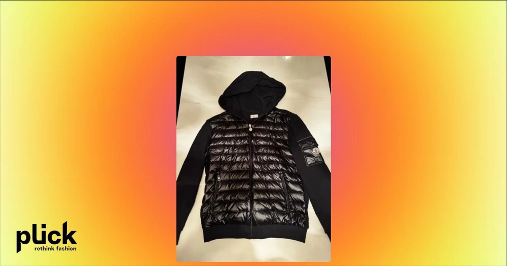 Svart hybridjacka med huva från Moncler - Snygg svart hybridjacka från Moncler med quiltad, glansig front och mjuka ärmar samt rygg i sweatshirtmaterial. Jackan har huva, dragkedja framtill, två sidofickor med dragkedja och Moncler-logga på ärmen. Perfekt för en trendig streetwear-look. OBS. Mer som storlek L.