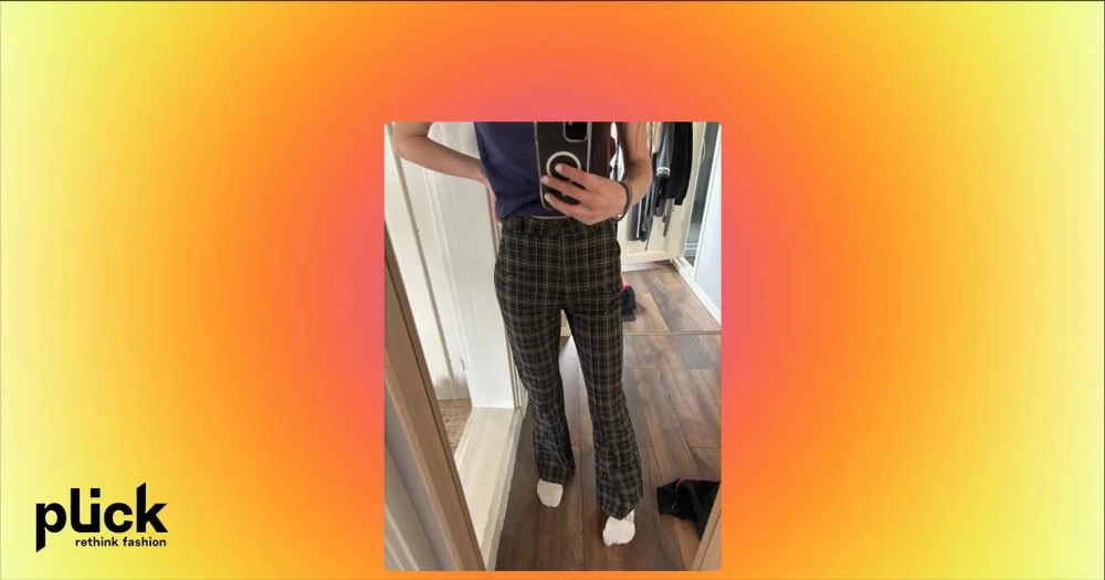 Rutig bootcut byxa i grönt och svart - Snygga bootcut-byxor med rutigt mönster i grönt, svart och vitt. Hög midja och klassisk passform som sitter bekvämt. HM storlek S, aldrig använt.