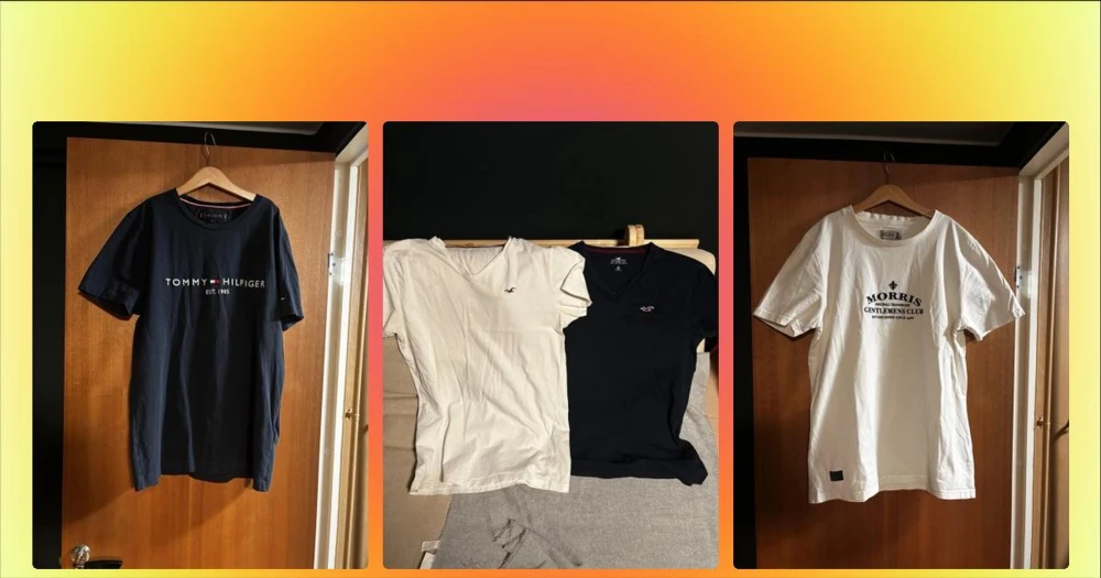 2-pack Hollister V-ringade T-shirts - Två klassiska V-ringade T-shirts från Hollister, en i vitt och en i mörkblått. Båda har den ikoniska lilla loggan broderad på bröstet. Perfekta basplagg i mjuk bomull med normal passform och korta ärmar.
