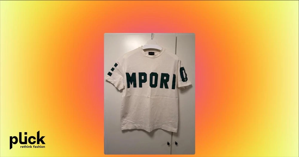 Vit t-shirt från Emporio Armani - Vit t-shirt från Emporio Armani med stora gröna bokstäver över bröstet och detaljer på ärmarna. Klassisk rund hals och rak passform, perfekt för en stilren och trendig look.