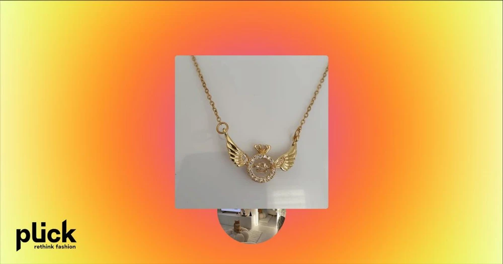 Guldhalsband med vingmotiv - Elegant guldhalsband med ett unikt hängsmycke i form av vingar och en cirkel dekorerad med glittrande stenar. Perfekt för att ge en touch av glamour till din stil.