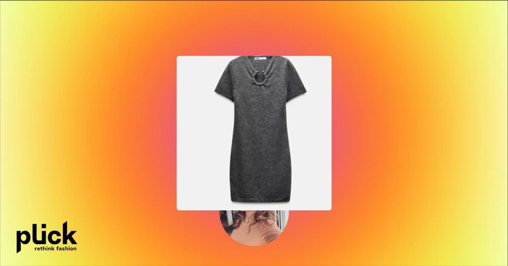 Grå stickad kortklänning från Zara - Mysig grå stickad kortklänning från Zara med korta ärmar och v-ringning. Snygg detalj med ring och pärlor vid halsen som ger en unik touch. Perfekt för dig som gillar enkel men trendig stil.