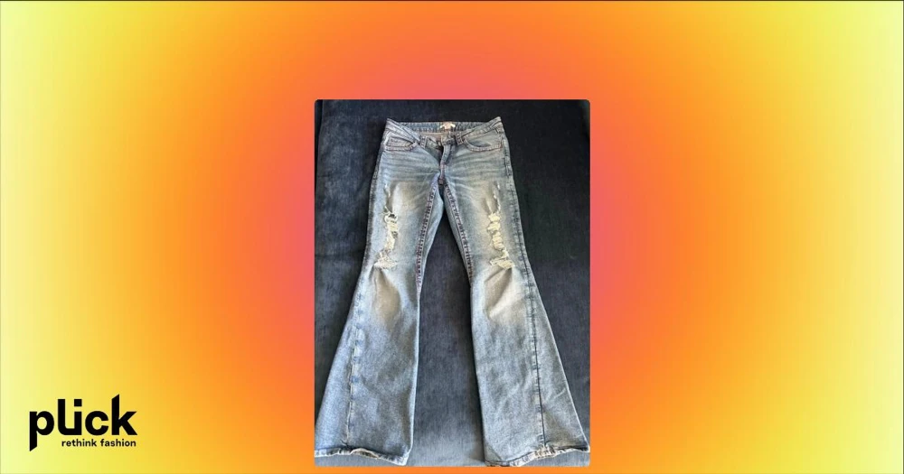 Jeans Gina tricot  - Säljer ett par ljusblå bootcut jeans med slitna detaljer på låren och knäna. Jeansen har fem fickor, röd kontrastsöm och klassisk knappgylf. Perfekta för dig som gillar en avslappnad och trendig look.