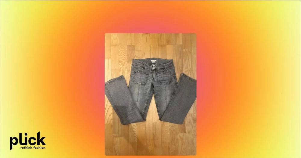 Grå lågmidjade jeans från Gina Tricot - Säljer ett par grå jeans från Gina Tricot i storlek 158. De har låg midja, bootcut och dubbla knappar framtill. Jeansen har klassiska fickor både fram och bak och är tillverkade i ett mjukt jeansmaterial.
