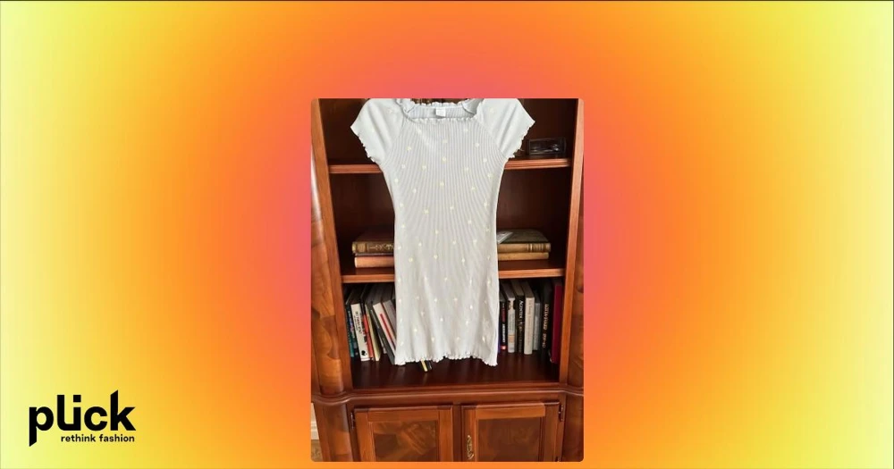 Ljusblå kortklänning med blommor - Söt ljusblå kortklänning med små vita och gula blommor, korta ärmar och volangkant upptill och nedtill. Perfekt för sommarens varma dagar och har en slim passform.