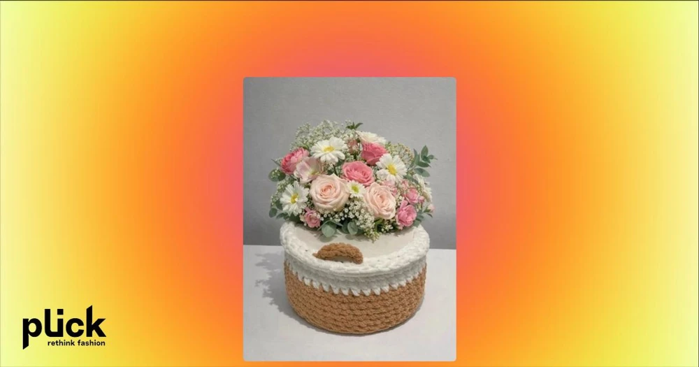 Handvirkad korg i beige och vitt - En rund handvirkad korg i mjukt garn med beige kant och vit botten. Perfekt för att förvara småsaker som parfym, deodorant eller andra accessoarer. Korgen har en mysig och stilren design som passar i de flesta rum.
