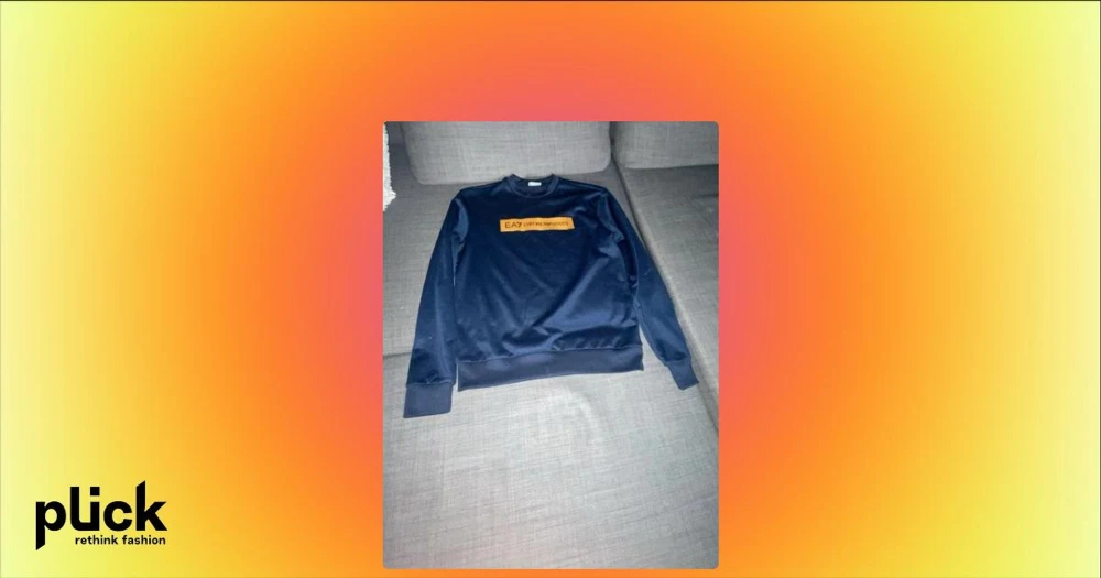 Mörkblå sweatshirt från EA7 Emporio Armani - Snygg mörkblå sweatshirt från EA7 Emporio Armani med orange logga på bröstet och liten logga i nacken. Tröjan har rund hals, långa ärmar och ribbade muddar. Perfekt för en avslappnad och trendig stil.