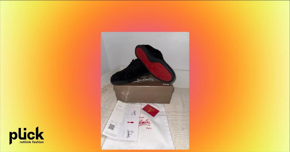 Svarta Louboutin sneakers med nitar - Säljer ett par svarta sneakers från Christian Louboutin med ikoniska röda sulor och coola svarta nitar över hela tån. Skorna är i mocka och har snörning. Perfekta för dig som vill sticka ut med en lyxig och edgy stil.