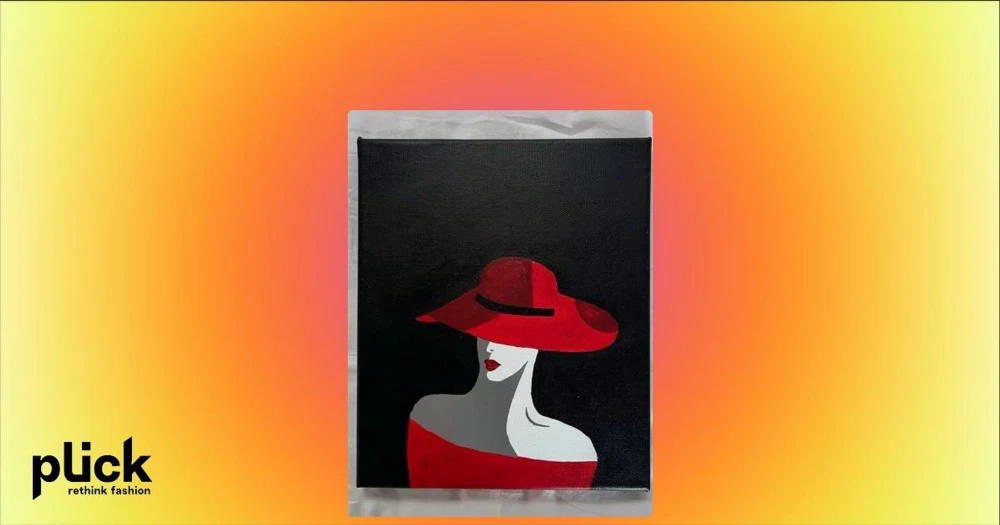 Hantverk Acrylic Tavla med kvinna i röd hatt.  - Hantverk Acrylic Unik tavla med motiv av en stilren kvinna i röd hatt och röd klänning mot svart bakgrund. Målningen har minimalistisk design med tydliga färgfält i rött, vitt, grått och svart. Perfekt som modern väggkonst för att lyfta rummet.