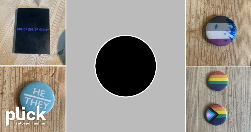 Rund knapp med pridefÀrger - En rund knapp med horisontella rÀnder i svart, grÄtt, vitt och lila. Den har ocksÄ blÄ fÀrgstÀnk pÄ ena sidan, vilket ger den en unik och konstnÀrlig touch. Perfekt för att fÀsta pÄ en vÀska eller jacka för att visa stöd och stolthet. (Lgbtq flagga)
