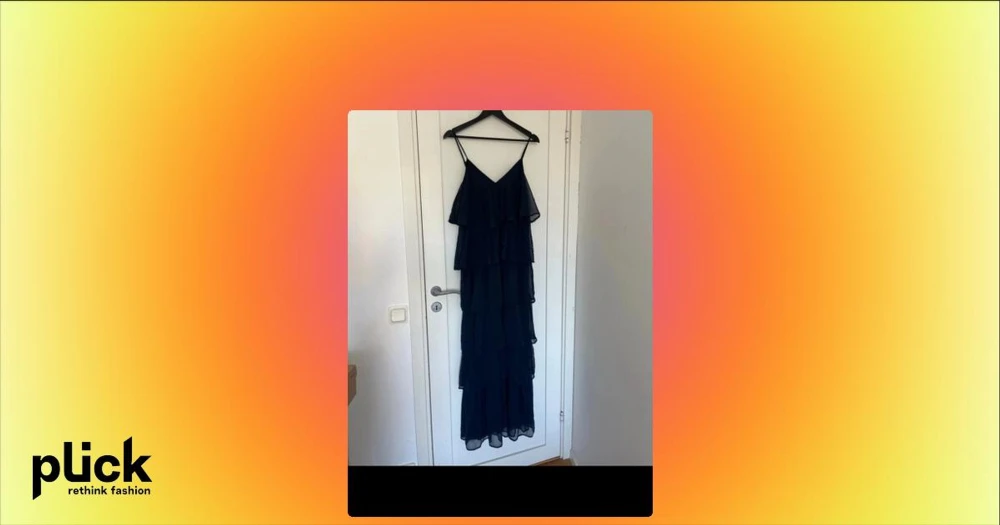 Marinblå långklänning med volanger - Säljer en marinblå långklänning med tunna axelband och flera lager volanger. Klänningen har en luftig och flowy känsla, perfekt för sommarens alla tillfällen. Materialet är lätt och ger ett elegant fall.