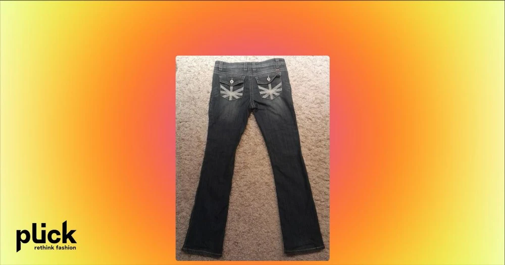 Mörkblå jeans med Union Jack-detalj - Mörkblåa Makers Of True Originals bootcut jeans för kvinnor. Ben innerlängd cirka 82cm, midja cirka 43cm halv mått (runt hela midjan är cirka 86cm)