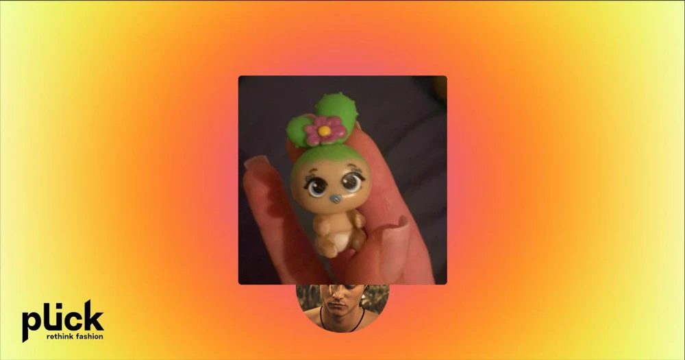 En liten docka med kaktus hår  - En liten figur med grönt hår och en rosa blomma på huvudet. Figuren har stora ögon och en napp i munnen. Den bär en vit blöja och har en söt, tecknad stil.