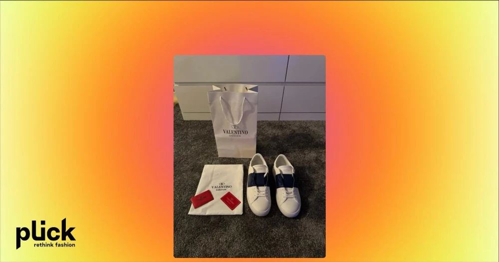 Valentino Garavani Open  - Säljer ett par snygga Valentino Garavani Open sneakers i vitt skinn med bred blå rem över vristen och ikoniska nitar på hälen. Klassisk rund tå och platt sula. Kommer med originalpåse och förpackning.