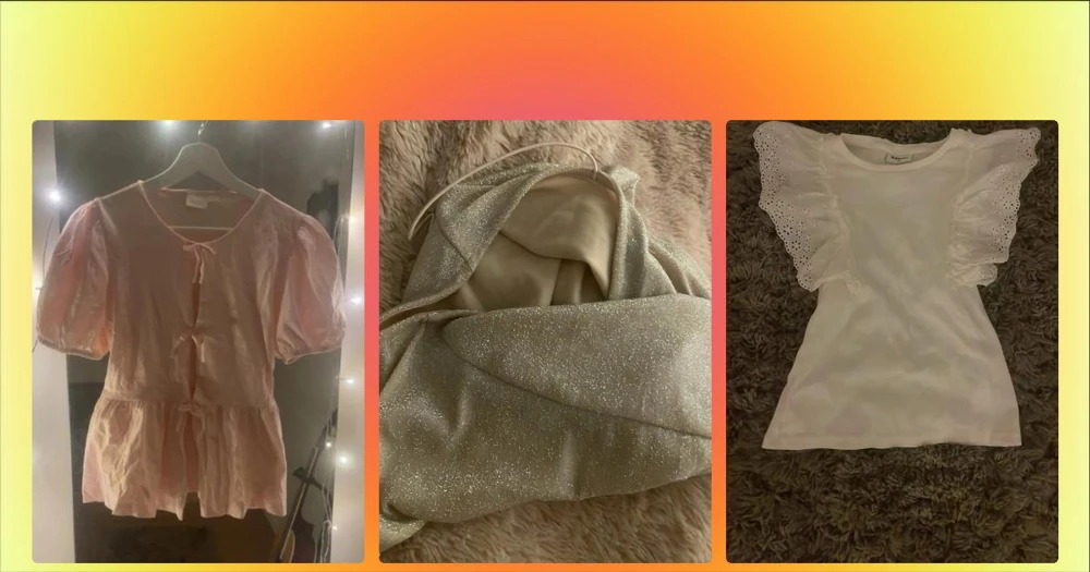 Ljusrosa blus med puffärm och rosetter - Aldrig använd! Supersöt ljusrosa blus med puffiga korta ärmar och tre rosetter framtill. Blusen har en luftig passform och volang nedtill,  Tillverkad i mjukt bomullstyg och passar perfekt till både jeans och kjol.