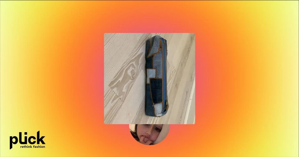 Patchwork denim pennskrin med dragkedja - Säljer en unik plånbok i patchwork denim med olika blå nyanser och synliga orange sömmar. Väskan har en metallfärgad dragkedja längs ovansidan och är smal och avlång i formen. Perfekt för att hålla ordning på småsaker i väskan.