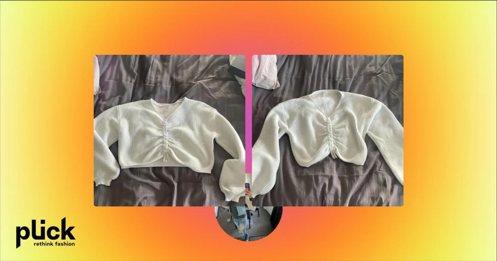 Vit croppad ribbad tröja med knyt - Säljer en vit croppad tröja med ribbad struktur och v-ringning. Tröjan har långa ärmar och snygg rynkdetalj med knyt framtill.