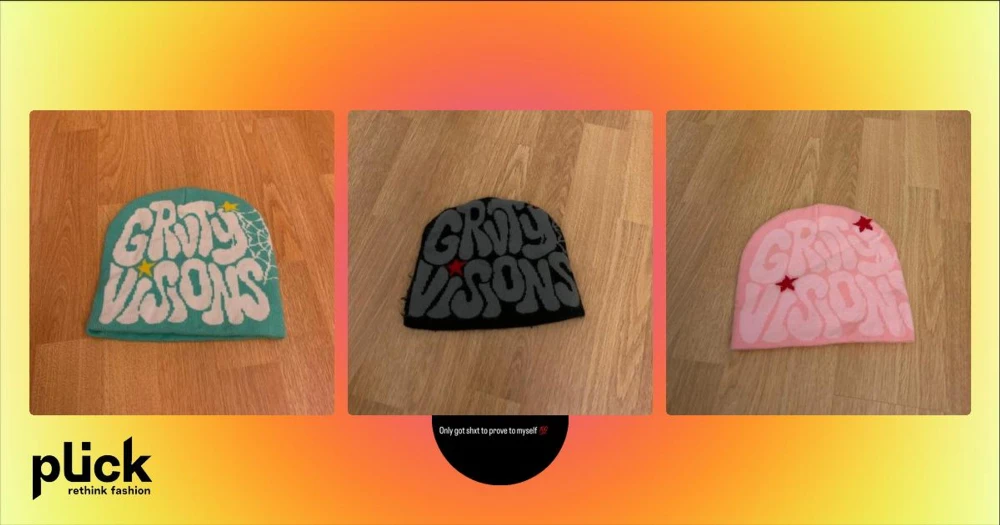 Turkos mössa med tryck - Cool turkos mössa med texten 'GRAVITY VISIONS' i vitt och en stjärna i gult. Har ett spindelnätsmönster på sidan. Perfekt för att sticka ut i mängden!