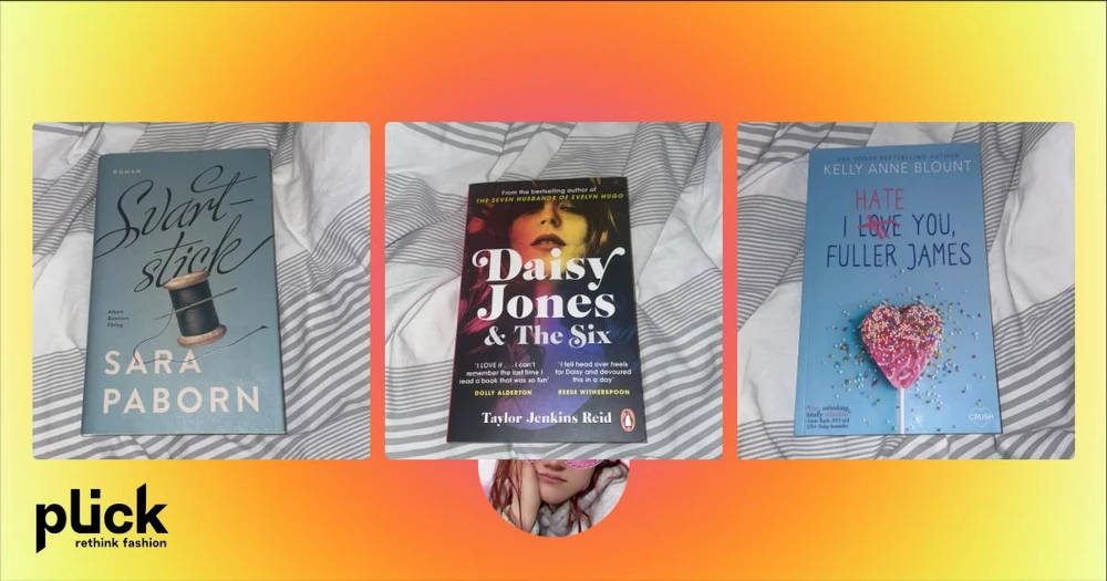 Daisy Jones & The Six - En populär roman på engelska, 'Daisy Jones & The Six', skriven av Taylor Jenkins Reid. Boken har ett färgstarkt omslag med ett porträtt och stora vita bokstäver. Perfekt för dig som gillar musik, 70-tal och dramatiska berättelser.
