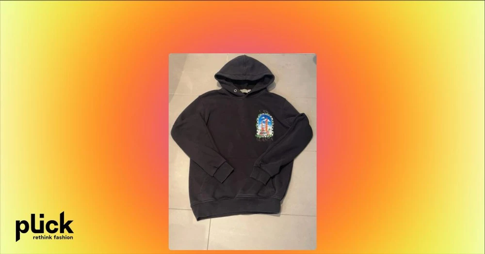 Svart hoodie från Casablanca - Svart hoodie från Casablanca med stor färgglad grafik av torn och palmer på ryggen samt mindre tryck på bröstet. Klassisk huva med dragsko och ribbade muddar. Perfekt för dig som gillar streetwear och vill sticka ut med snygg design.
