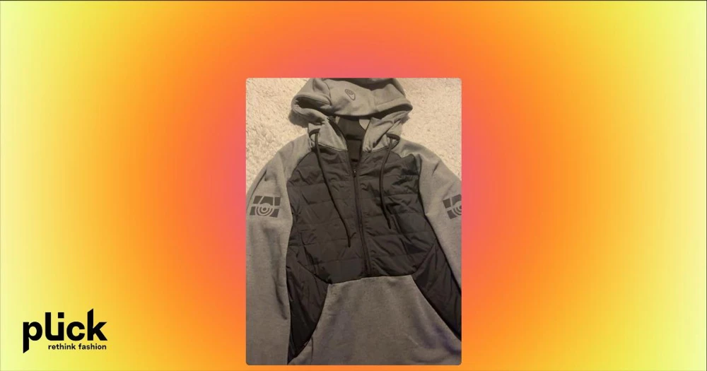 Grå och svart hoodie cardigan - Snygg hoodie cardigan i grått och svart med dragkedja framtill och quiltad front. Har tryck på ärmarna och huvan samt en gul detalj på baksidan av huvan. Justerbar huva med snören och mjukt material, perfekt för chill dagar.