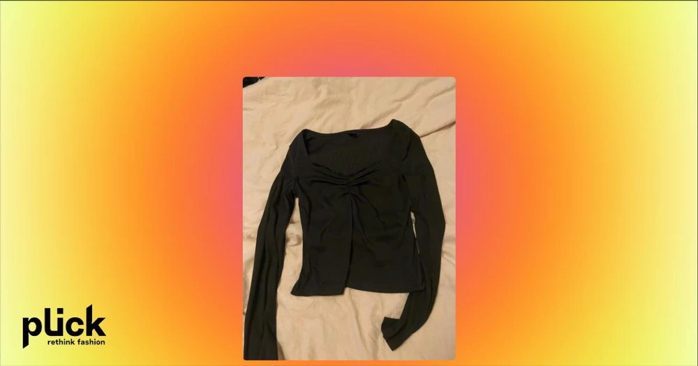 Svart croppad långärmad topp - Trendig svart croppad topp med lång ärm och snygg rynkning vid bysten. Toppen har en bred, fyrkantig ringning och är tillverkad i ett ribbat material som ger en skön och stretchig passform. Perfekt att styla med höga jeans eller kjol.