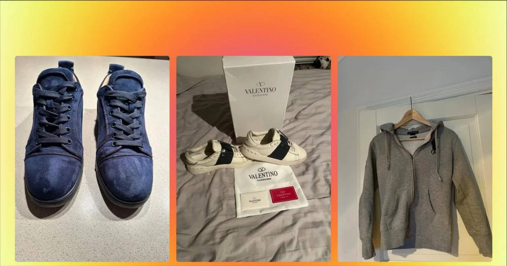 Valentino Garavani vita sneakers - Säljer ett par vita Valentino Garavani sneakers med bred mörkblå rem över sidan och ikoniska nitar runt hälen. Skorna har snörning och är tillverkade i skinn. Medföljer originalkartong, dustbag och äkthetskort. Perfekta för dig som gillar exklusiva detaljer och stilren design. Det är lite slitningar på dem