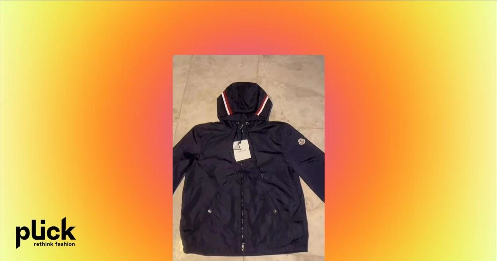 Svart vindjacka från Moncler - Svart vindjacka från Moncler med huva och snygga rödvita detaljer på insidan av huvan. Jackan har dragkedja framtill, snörning vid huvan och Moncler-logga på ärmen. Tillverkad i lätt polyester, perfekt för blåsiga dagar. Fickor med tryckknappar och stilren design. Passar för både storlek S och M.