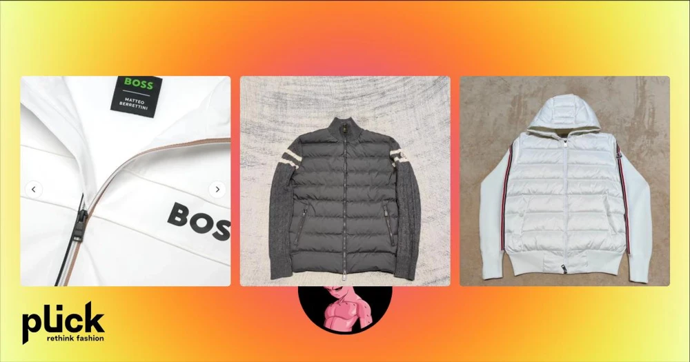 Grå dunväst från Moncler med stickade ärmar - Snygg grå dunväst från Moncler med stickade ärmar och vita ränder. Västen har dragkedja framtill, två fickor med dragkedja och Moncler-logga på ärmen. Perfekt för stilrena outfits Storlek L/M
