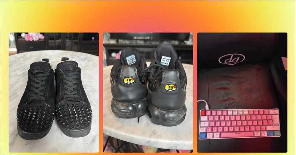 Svarta sneakers med nitar - Svarta sneakers från Christian Louboutin i mocka med svarta nitar över tån och svarta skosnören. Låg modell med rund tå och diskreta detaljer på sidorna. Insidan är beige och sulan är svart. Perfekta för dig som vill sticka ut med en edgy stil. Men de är lite slitna i insidan samt så saknas det 2 spikar, inget som märks. Då du har på dig skon och inte visar hur de ser ut inuti för allmänheten😅Spikarna, en är av längst ner på sidan utav skon och andra är längst fram.