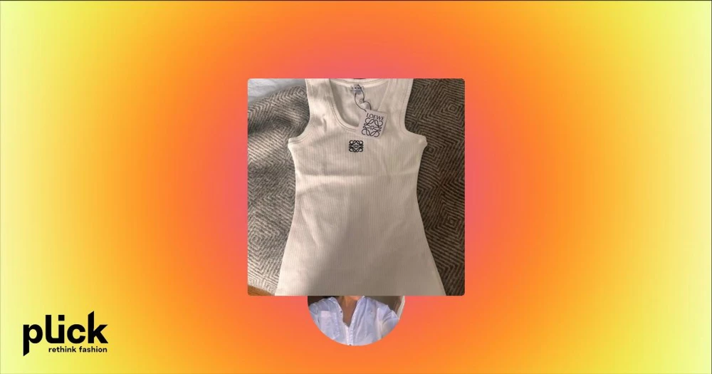 Vit ribbad linnetopp från Loewe - Säljer en stilren vit ribbad linnetopp från Loewe med broderad logga framtill. Toppen har en klassisk rund halsringning och är ärmlös, perfekt för en trendig och enkel look.