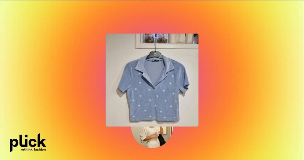 Ljusblå croppad polotopp med stjärnor - Superfin ljusblå croppad polotopp från sinsay med korta ärmar och vitbroderade stjärnor över hela toppen. Mjuk manchesterkänsla och öppen krage.