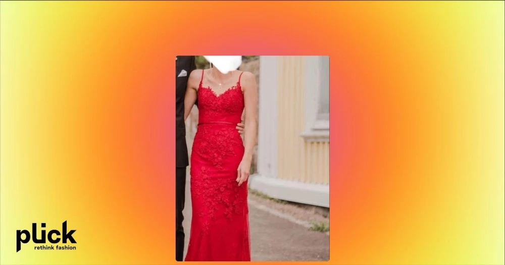 Röd balklänning  - Säljer en elegant röd långklänning med smala axelband och v-ringad urringning. Klänningen har vackra blommiga spetsdetaljer och ett smalt bälte i midjan. Perfekt för bal eller fest!