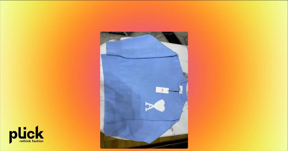 Ami Paris tröja - Snygg ljusblå stickad tröja från Ami Alexandre Mattiussi med ett vitt hjärtmönster och A-logga på bröstet. Tröjan har rund hals, ribbade muddar och är långärmad. Perfekt för dig som gillar stilrena detaljer och vill ha något som sticker ut.