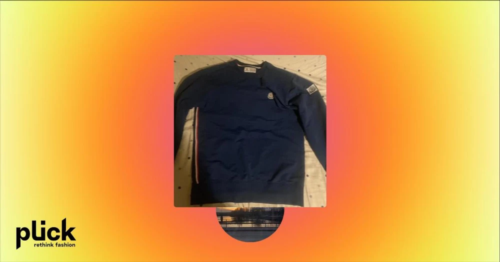 Blå tröja från Moncler - Säljer en snygg blå tröja från Moncler med deras ikoniska logga på bröstet och ärmen. Tröjan har en ribbad krage och ränder i rött, vitt och blått längs sidan. Perfekt för en stilren look.
