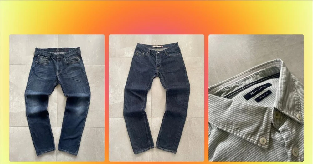 Blå slitna jeans från DonDup - Säljer ett par blå jeans från Dondup med snyggt slitna detaljer och klassisk femficksmodell. Jeansen har kontrastsömmar i orange och en rak passform. Materialet är mjuk denim i bomull som ger en avslappnad look. Mått 📏 Totallängd: 105cm Midjelängd: 40cm Innersömmlängd: 81cm Lårviddlängd: 27cm Skador 🔧: Litet hål vid innersömmen, små skador vid benöppningarna, visas på bild